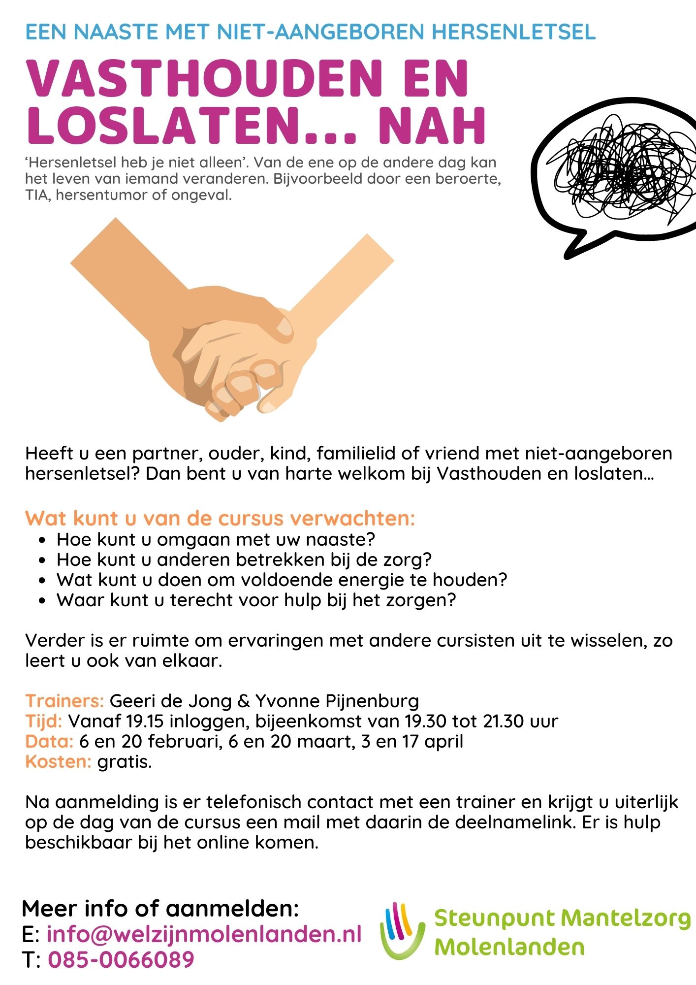 Op maandag 6 februari 2023 begint de gratis cursus Vasthouden en Loslaten… mantelzorg bij niet-aangeboren hersenletsel (NAH). Deze online cursus is voor mantelzorgers en betrokken naasten van iemand met niet-aangeboren hersenletsel.
