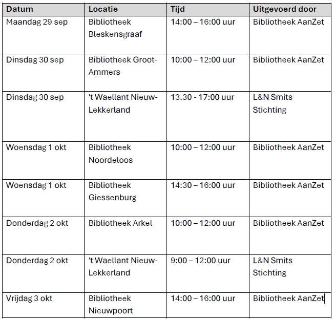 Om inwoners te helpen bij het installeren en gebruiken van de app organiseert Bibliotheek AanZet samen met de L&N Stichting verschillende inloopmomenten. Hieronder vindt u het schema.