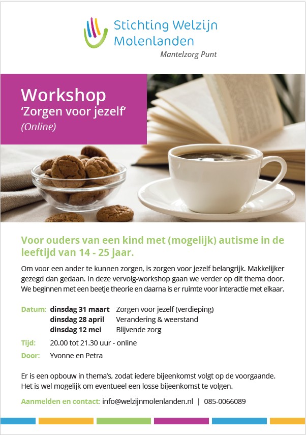 Om voor een ander te kunnen zorgen, is zorgen voor jezelf belangrijk. Makkelijker gezegd dan gedaan. In deze vervolg-workshop gaan we verder op dit thema door. We beginnen met een beetje theorie en daarna is er ruimte voor interactie met elkaar.